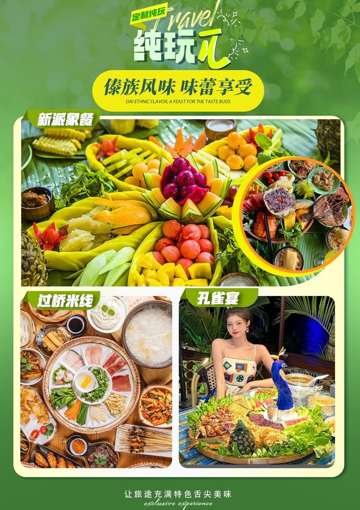 乘车前往游览高人气网红打卡点【傣族园】(AAAA景区,游览时间约120分钟,电瓶车60元/人自理)掩映于苍翠雨林间,竹楼错落,佛塔鎏金,澜沧江畔的傣族园如一颗镶嵌在绿毯上的明珠,弥漫着湿润的热带气息与花果芬芳。阳光下银钵飞舞,水花四溅,欢声震天,泼水广场每日上演的湿身狂欢,是傣族对生命与祝福最炽热的表达。(景区商业板块与旅行社无关)结束后来到【告庄西双景】 (送到景区, 自行游览, 结束后自行打车回酒店) 是东南亚最-大的夜市。每至傍晚, 这里便人头攒 动, 各种应景的水果、小吃、服饰、纪念品琳琅满目, 所有人间烟火的气息都氤氲在西双版纳炎热潮湿的热带雨林气候里, 集结于 这座城市的上空。随着夜幕的降临, 大大小小的摊位亮起点点灯光, 闪烁蜿蜒, 仿佛一条璀璨星河。而被夜市环绕的大金塔寺也与 白天不同, 夜晚的佛塔被华灯照的熠熠生辉, 通体发亮, 在夜幕背景下看起来格外恢弘。站在大金塔上俯瞰夜市, 流动的人群穿梭 在点点“星光”间, 带着整个“星河”也流动起来。特别赠送【民族换装秀】 (不参与不退费) 感受民族特色美, 做一回唯美傣家 人, 留下版纳最美的印记。大人和孩子分别选上自己喜欢的傣家服装, 一家人最美好的瞬间定格。