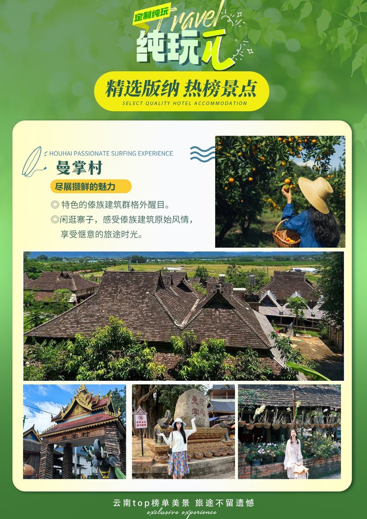 午餐后游览【曼掌村】 (游览时间约120 分钟) 走进曼掌村, 特色的傣族建筑群格外醒目, 绿植和花草为这里增添了另一种美丽。每户村民家里都种植着各种花草, 让整个村庄美得精巧自然。在村寨外, 还有一条河, “村光”与河水交相辉映, 编织出的 山水画, 就是你想象中的样子。今日特别安排赠送【水果采摘】 (不参与不退费) 入园采摘的水果均是云南省热带水果。让您走进果园亲手采摘并品尝到西双版纳“水果妈妈”的味道。来西双版纳一定要带您爱的人体验不一样的采摘风情!全年可采摘水果种类繁多,采摘水果根据季节性成熟情况调整,。采摘水果品尝提倡不浪费,如需带走水果可根据果园内市价购买*如果没有应季水果、水果不成熟或下雨,采摘更换为制作芭蕉叶粑粑。