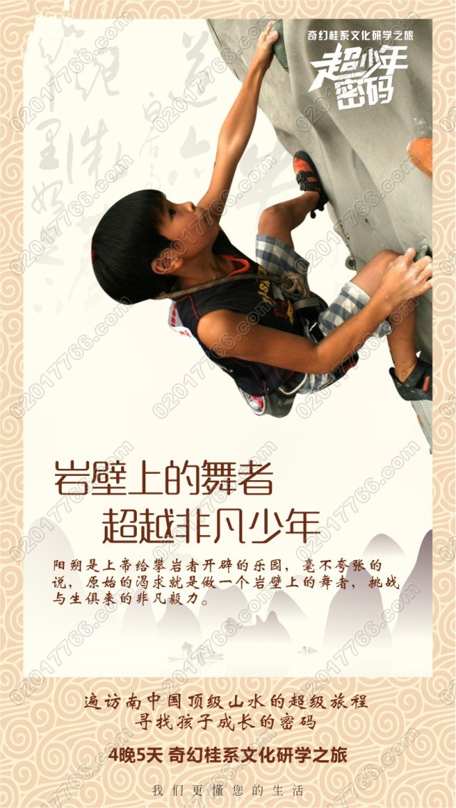 13:30 随后来到秀美的【阳朔】,这里是一个开放式的交际舞台,更是一个上帝给攀岩者开辟的乐园,毫不夸张的说,原始的渴求就是做一个岩壁上的舞者,挑战与生俱来的非凡毅力。锻炼小朋友的毅力,培养团队精神。来到攀岩基地挑战自我,这就需要你的小小勇气咯。完成任务有神秘小礼品赠送,快快行动吧~~