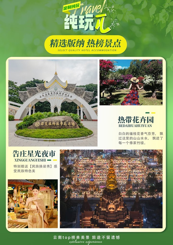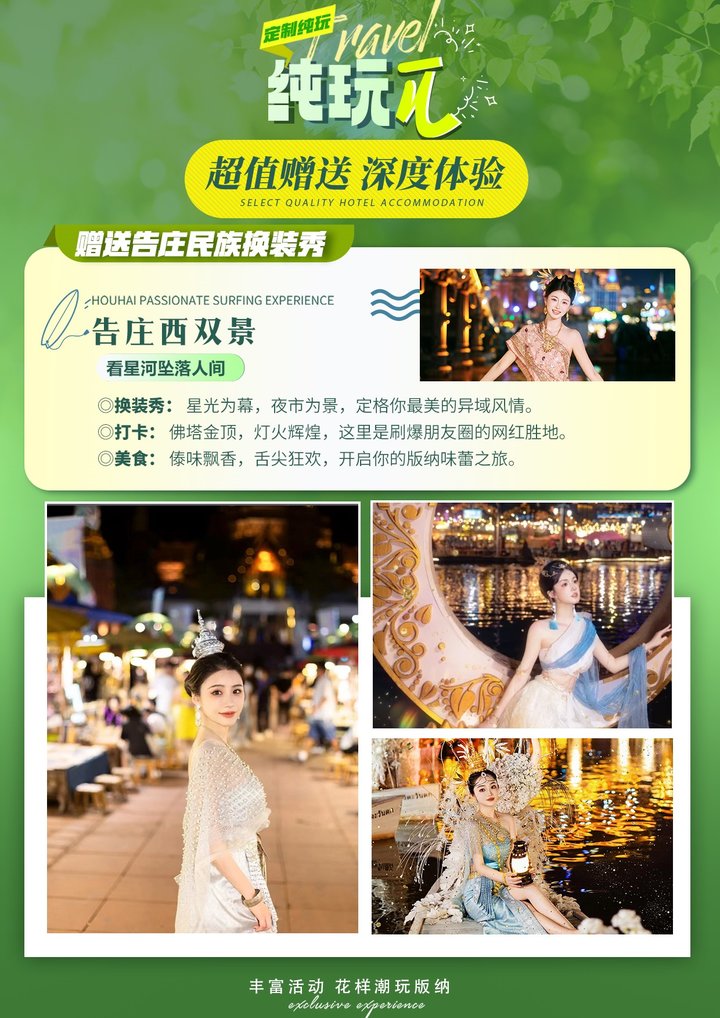 乘车前往游览高人气网红打卡点【傣族园】(AAAA景区,游览时间约120分钟,电瓶车60元/人自理)掩映于苍翠雨林间,竹楼错落,佛塔鎏金,澜沧江畔的傣族园如一颗镶嵌在绿毯上的明珠,弥漫着湿润的热带气息与花果芬芳。阳光下银钵飞舞,水花四溅,欢声震天,泼水广场每日上演的湿身狂欢,是傣族对生命与祝福最炽热的表达。(景区商业板块与旅行社无关)结束后来到【告庄西双景】 (送到景区, 自行游览, 结束后自行打车回酒店) 是东南亚最-大的夜市。每至傍晚, 这里便人头攒 动, 各种应景的水果、小吃、服饰、纪念品琳琅满目, 所有人间烟火的气息都氤氲在西双版纳炎热潮湿的热带雨林气候里, 集结于 这座城市的上空。随着夜幕的降临, 大大小小的摊位亮起点点灯光, 闪烁蜿蜒, 仿佛一条璀璨星河。而被夜市环绕的大金塔寺也与 白天不同, 夜晚的佛塔被华灯照的熠熠生辉, 通体发亮, 在夜幕背景下看起来格外恢弘。站在大金塔上俯瞰夜市, 流动的人群穿梭 在点点“星光”间, 带着整个“星河”也流动起来。特别赠送【民族换装秀】 (不参与不退费) 感受民族特色美, 做一回唯美傣家 人, 留下版纳最美的印记。大人和孩子分别选上自己喜欢的傣家服装, 一家人最美好的瞬间定格。