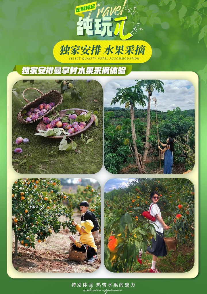 午餐后游览【曼掌村】 (游览时间约120 分钟) 走进曼掌村, 特色的傣族建筑群格外醒目, 绿植和花草为这里增添了另一种美丽。每户村民家里都种植着各种花草, 让整个村庄美得精巧自然。在村寨外, 还有一条河, “村光”与河水交相辉映, 编织出的 山水画, 就是你想象中的样子。今日特别安排赠送【水果采摘】 (不参与不退费) 入园采摘的水果均是云南省热带水果。让您走进果园亲手采摘并品尝到西双版纳“水果妈妈”的味道。来西双版纳一定要带您爱的人体验不一样的采摘风情!全年可采摘水果种类繁多,采摘水果根据季节性成熟情况调整,。采摘水果品尝提倡不浪费,如需带走水果可根据果园内市价购买*如果没有应季水果、水果不成熟或下雨,采摘更换为制作芭蕉叶粑粑。