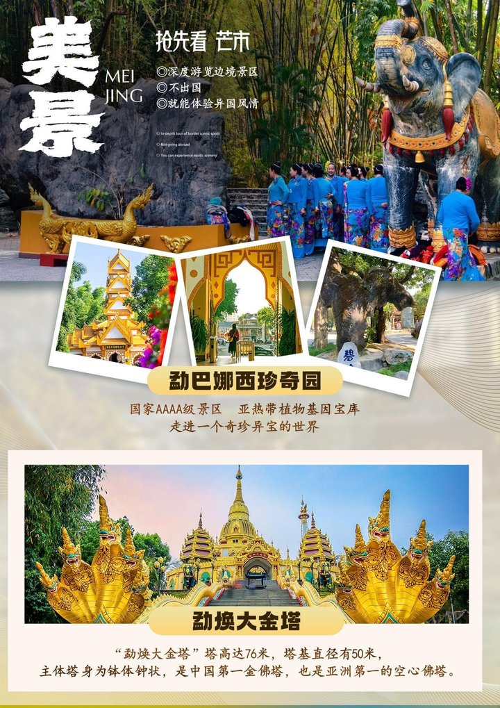 【上午】;乘车前往瑞丽游览【一寨两国】(游览时间60分钟):瑞丽市西南约11公里,有一个世界少有的边境人文地理景观小寨—— 银井,有名的中缅边境71号界碑矗立寨中,国界线从该寨中央蜿蜒划过,是个典型的“一寨两国”边境地区。参观【姐告边境贸易区】:含国 门、天涯地角、中缅友谊桥