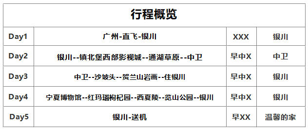 10、宁夏等西北地区由于地域辽阔,景点之间的车程较长,请游客注意休息调配好时间,以充足的体力参加旅游活动。