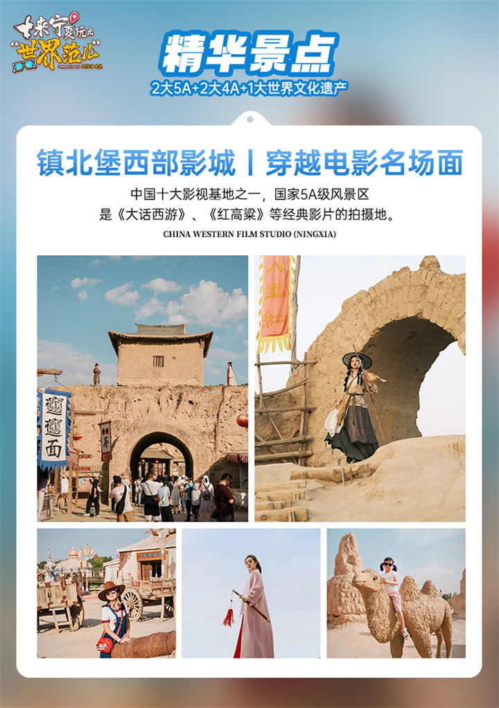 酒店早餐后前往【镇北堡西部影视城】(银川/影视城25KM,停留约2小时)这里以古朴、原始、粗犷、荒凉为特色,是《大话西游》、《红高粱》等经典影片的拍摄地。三月春风略带凉意,行走其间,在苍凉的古堡背景下,春风拂过,紫霞仙子的身影仿佛就在眼前。这里是造梦工厂,更是你圆梦的舞台。并体会苍凉背后的侠骨柔情与电影艺术的魅力。