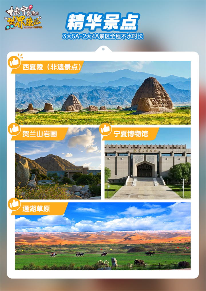 前往参观【西夏陵】(红玛瑙/西夏陵15KM,含电瓶车+3D电影,游览约3小时)在历史的长河中,有许多遗迹如璀璨星辰,默默诉说着往日的辉煌。西夏陵,就是这样一处承载着厚重历史与文化的瑰宝。2025年7月11日,在法国巴黎召开的联合国教科文组织第47届世界遗产大会上,西夏陵成功列入《世界遗产名录》,开启了它在世界舞台上闪耀的新篇章。是中国现存规模最-大、地面遗址最完整的帝王陵园之一,也是现存规模最-大的一处西夏文化遗址 ,是 国家AAAA级景区 被世人誉为“ 神秘的奇迹 ”“ 东方金字塔 ”。前往参观【览山公园】(停留约1 小时)登上仿古罗马式建筑风格的露天剧场,俯瞰银川市区,是观赏塞上黄昏日落的绝佳位置。在仿古罗马剧场欣赏一场绝美的塞上日落,为旅程镀上金色滤镜。