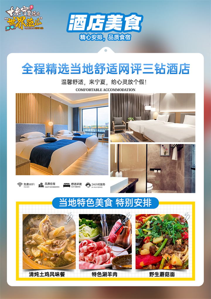 2、用餐:含4早3正(清炖土鸡,铜锅涮羊肉(不足10人安排品尝羊肉泡馍),贺兰山野生蘑菇面,晚餐留白)。(早餐为酒店团队房价包含,为酒店配送,不吃不退)西北地区用餐口味以及餐质可能和其他地区不同,不习惯者请提前自备佐食,因整体餐费不以个人用餐与否减少,自愿放弃用餐无费用可退,敬请谅解。用餐后的休息时间属自由活动时间,请注意个人财产以及人身安全。